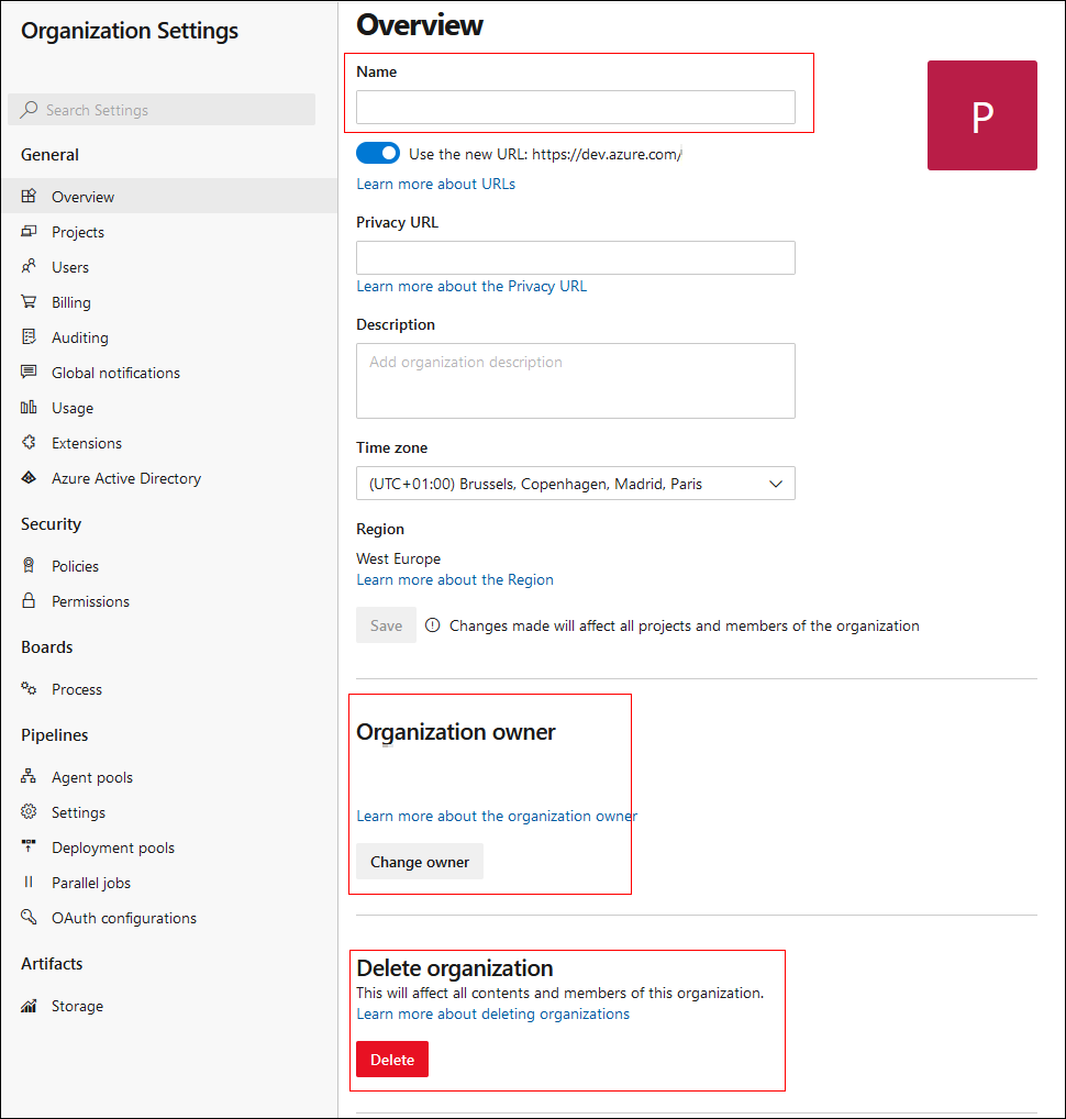 Let's have a look at some important settings. In the Overview section. You can change the name of the organization as well as the organization owner. If you ever need to delete your organization, you can do that in this overview section.