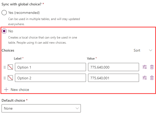 A local choice only exists for the table column. Selecting No for Sync with global choice displays the list of choices that you can add to or edit within the table column, and it can't be used for other tables in your environment.