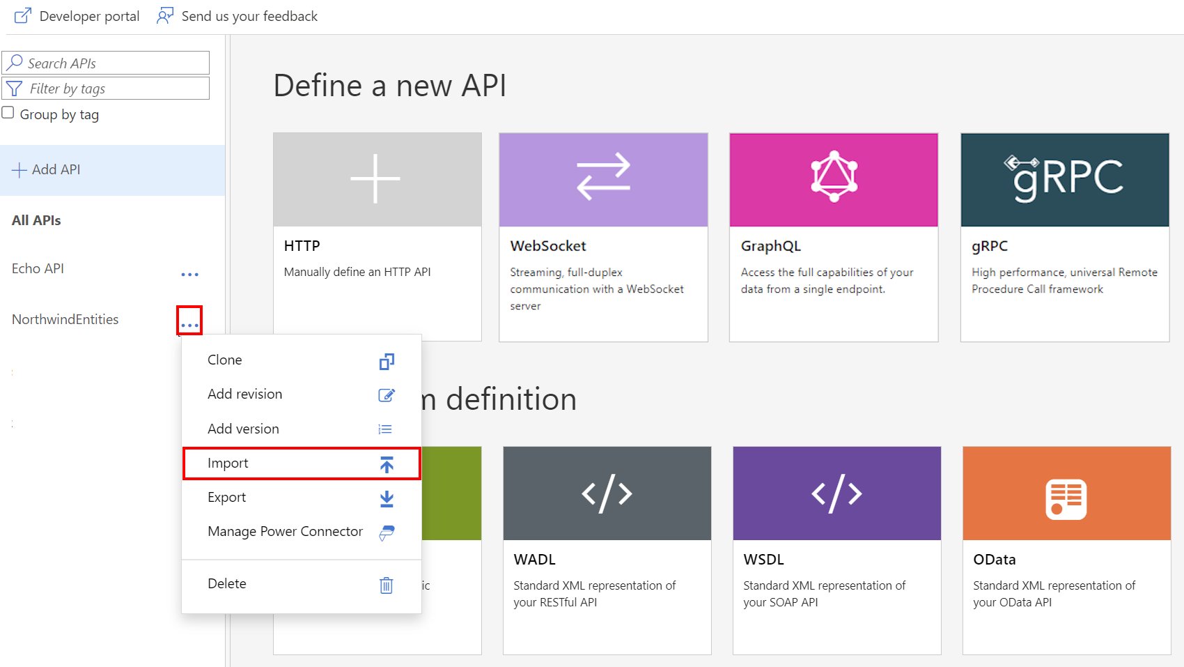 Select APIs on the Overview page or select APIs > APIs in the menu on the left.