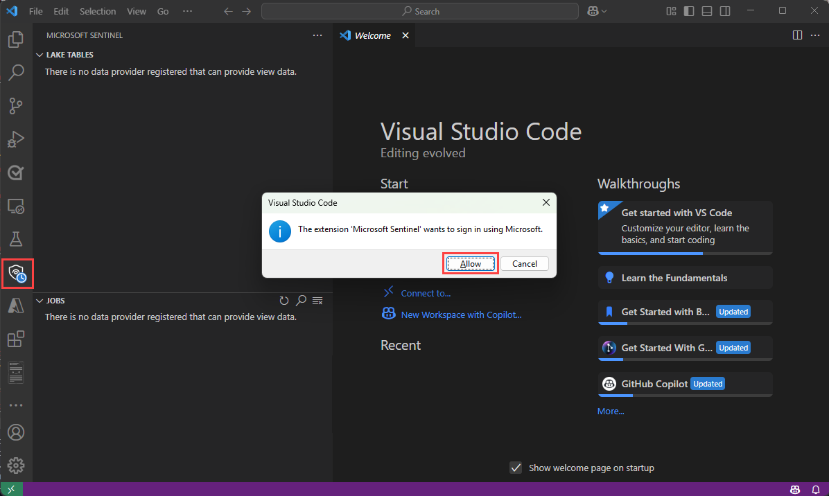 A dialog appears with the following text The extension "Microsoft Sentinel" wants to sign in using Microsoft. Select Allow.
