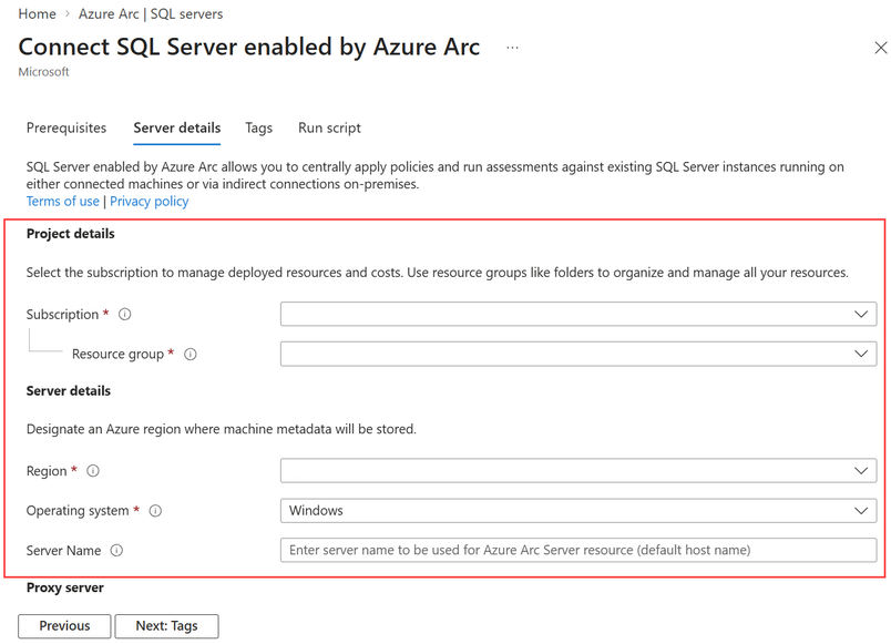 If the machine that hosts the SQL Server instance is already connected to Azure Arc, make sure to select the same resource group that contains the corresponding Server - Azure Arc resource.