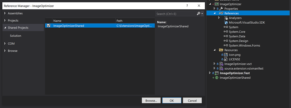This section assumes that you've completed the steps to factor your Visual Studio extension with shared projects.
