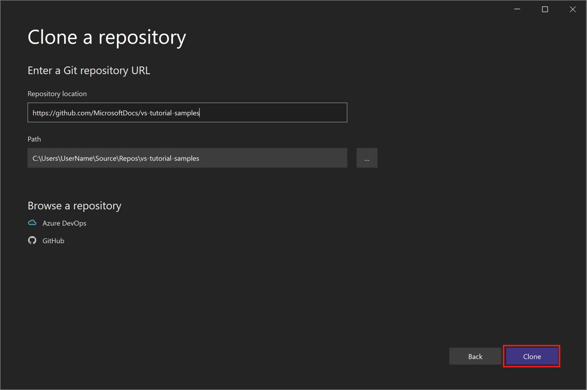 In this tutorial, you use Visual Studio to connect to a repository, or repo, for the first time, clone it, and then open a project from it.