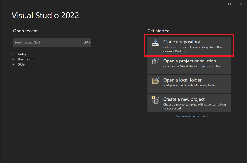 Visual Studio makes it easy to open a project from a repo. You can do so when you start Visual Studio, or you can do so directly from within the Visual Studio IDE.