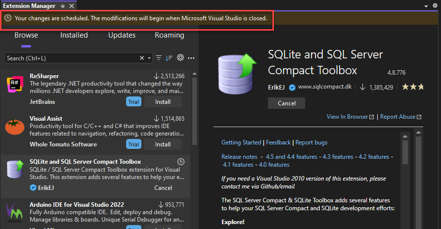 After the download completes, you see a notification at the top of Extension Manager: "Your changes are scheduled. The modifications will begin when Microsoft Visual Studio is closed."
