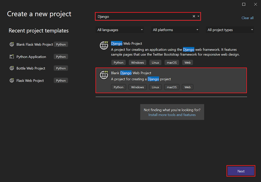In Visual Studio, select File > New > Project and search for "Django." Then, select the Blank Django Web Project template and select Next.