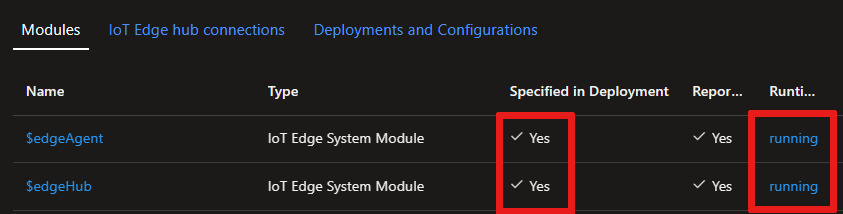 Check that your device and modules are deployed and running, by viewing your device page in the Azure portal.