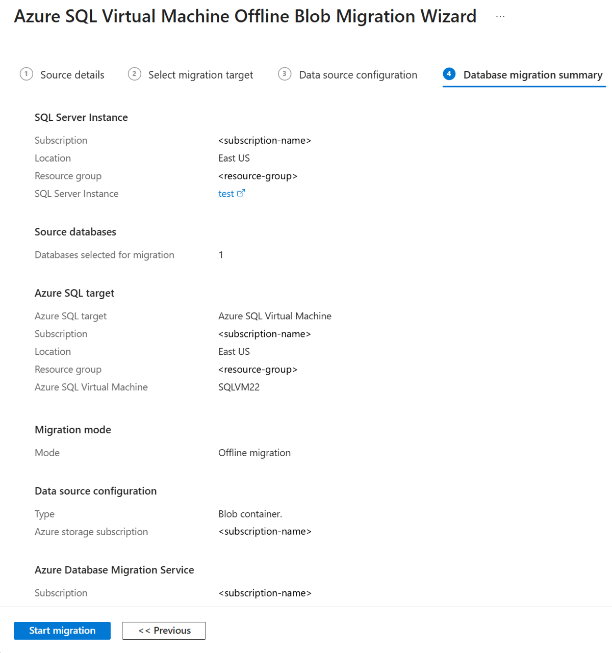 Name Description Resource group The resource group where backup files are located. Storage account details The storage account where backup files are located. Blob container The blob container where backup files are located. Folder The folder where backup files are located. Last Backup File The file name of the last backup of the database you're migrating. Target database name You can modify the target database name during the migration process. If loopback check functionality is enabled and the source SQL Server and file share are on the same computer, the source can't access the file share with the FQDN. To fix this issue, disable loopback check functionality.