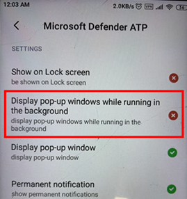 Xiaomi devices include a new permission model. This permission model prevents Defender for Endpoint for Android from displaying pop-up windows while it runs in the background.