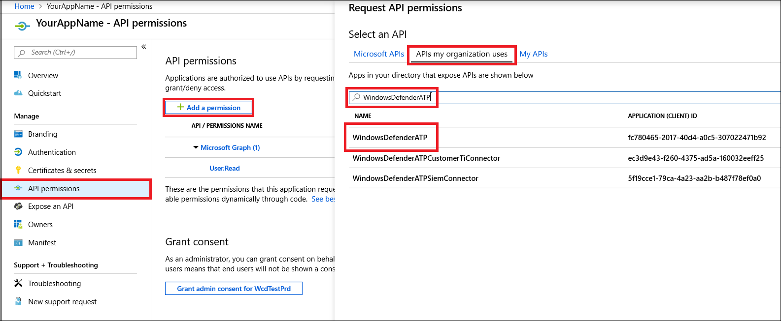 On your application page, select API Permissions > Add permission > APIs my organization uses > type WindowsDefenderATP and select on WindowsDefenderATP.
