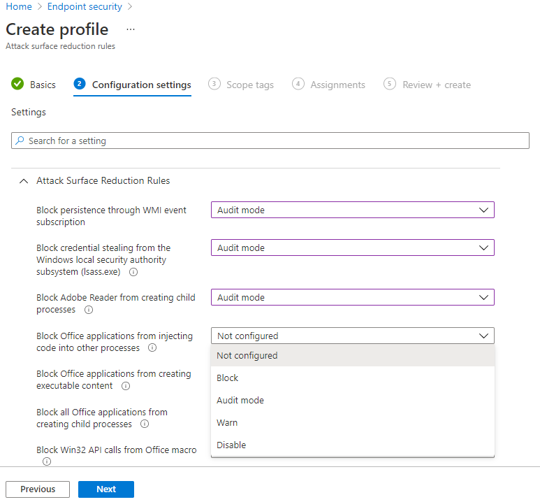 In the Configuration settings tab, under Attack Surface Reduction Rules, set all rules to Audit mode.