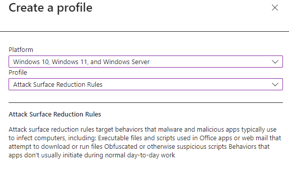 In Platform, select Windows 10, Windows 11, and Windows Server, and in Profile, select Attack surface reduction rules.
