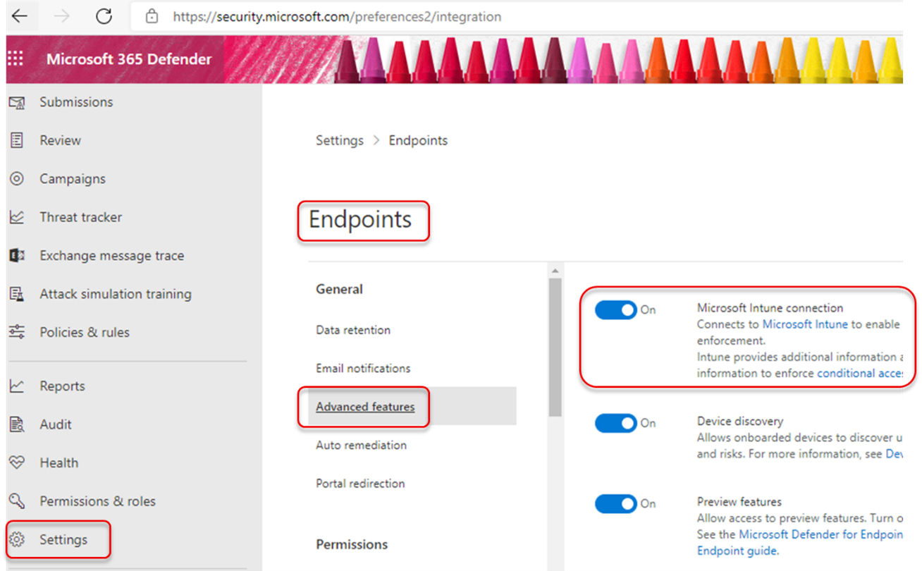 In the Microsoft Defender portal, go to Settings > Endpoints > Advanced Features and ensure that Microsoft Intune connection is enabled.Verify that the APP connector is enabled in Intune portal.