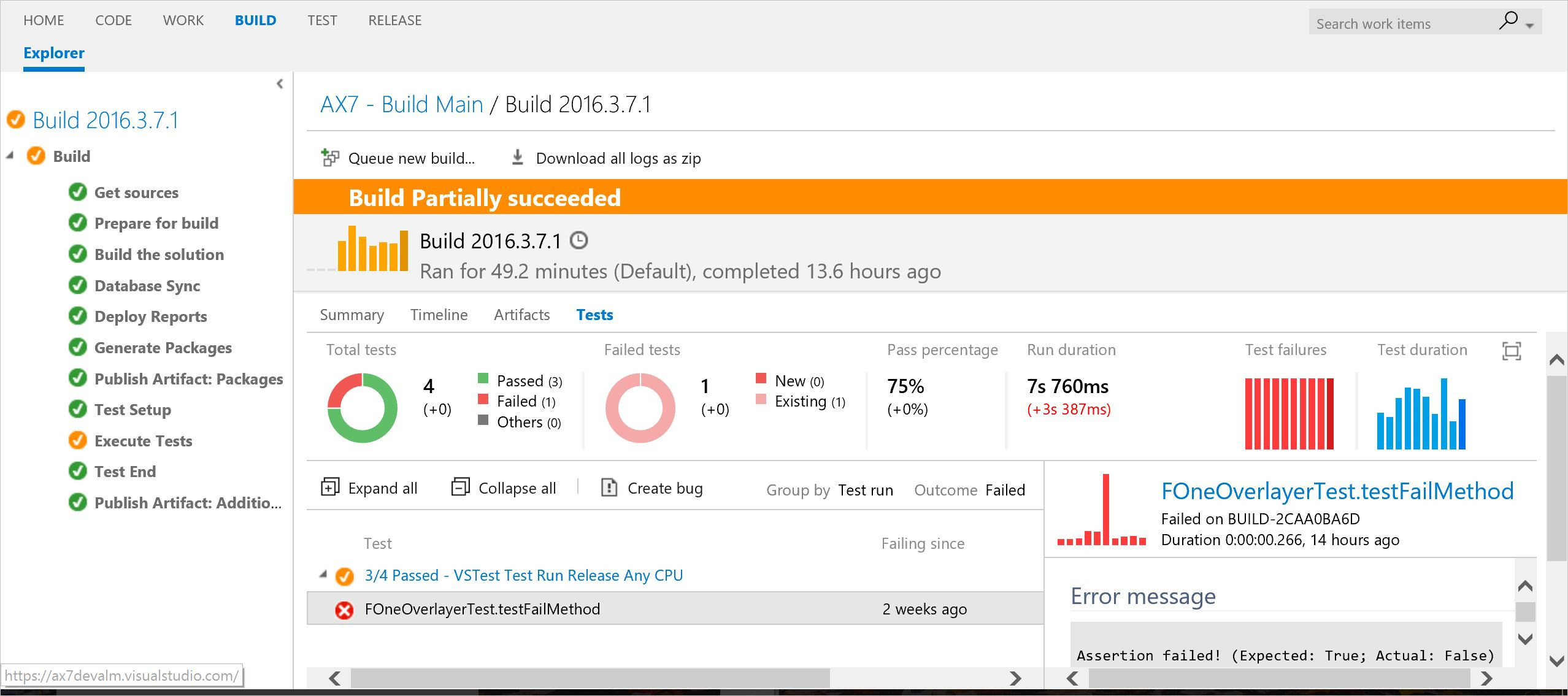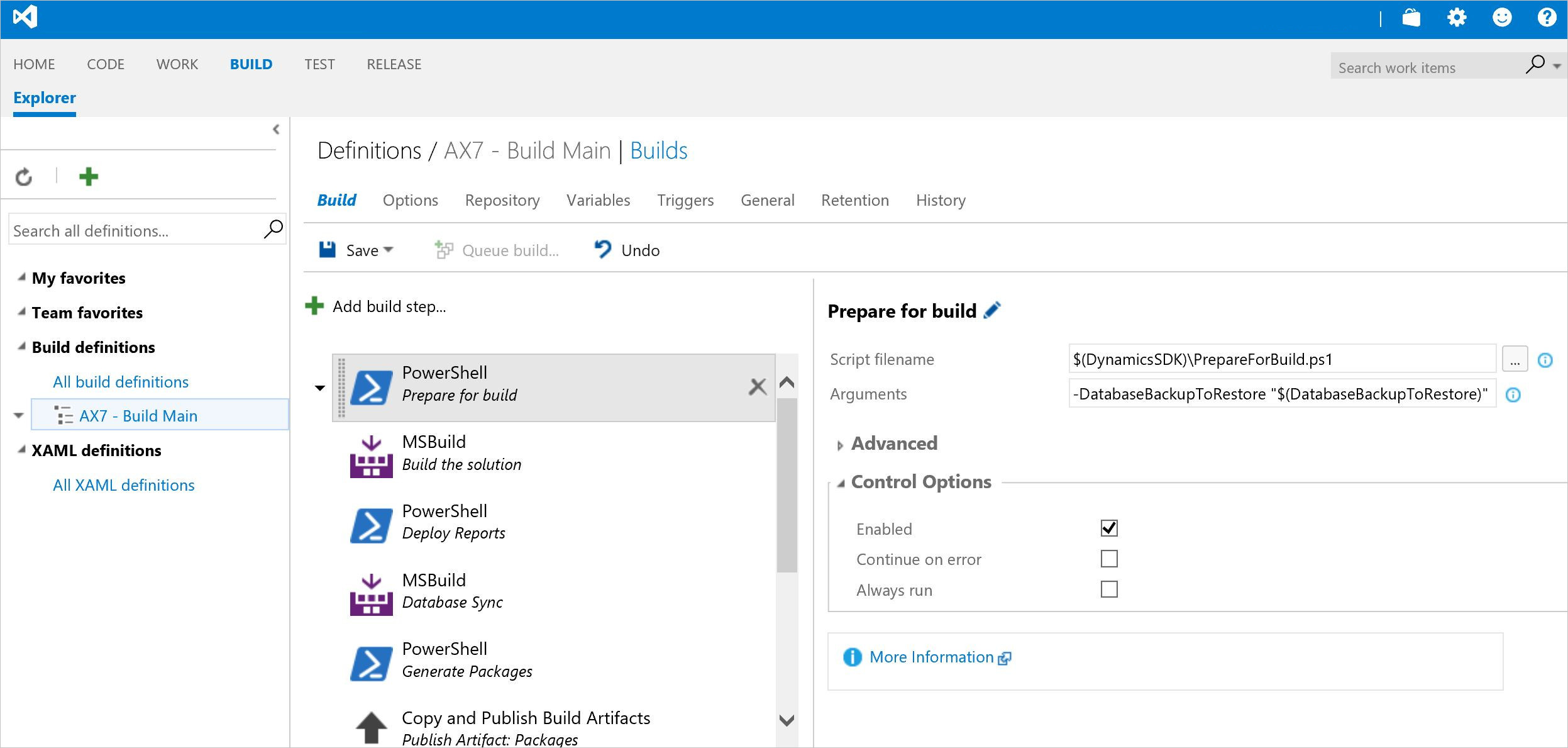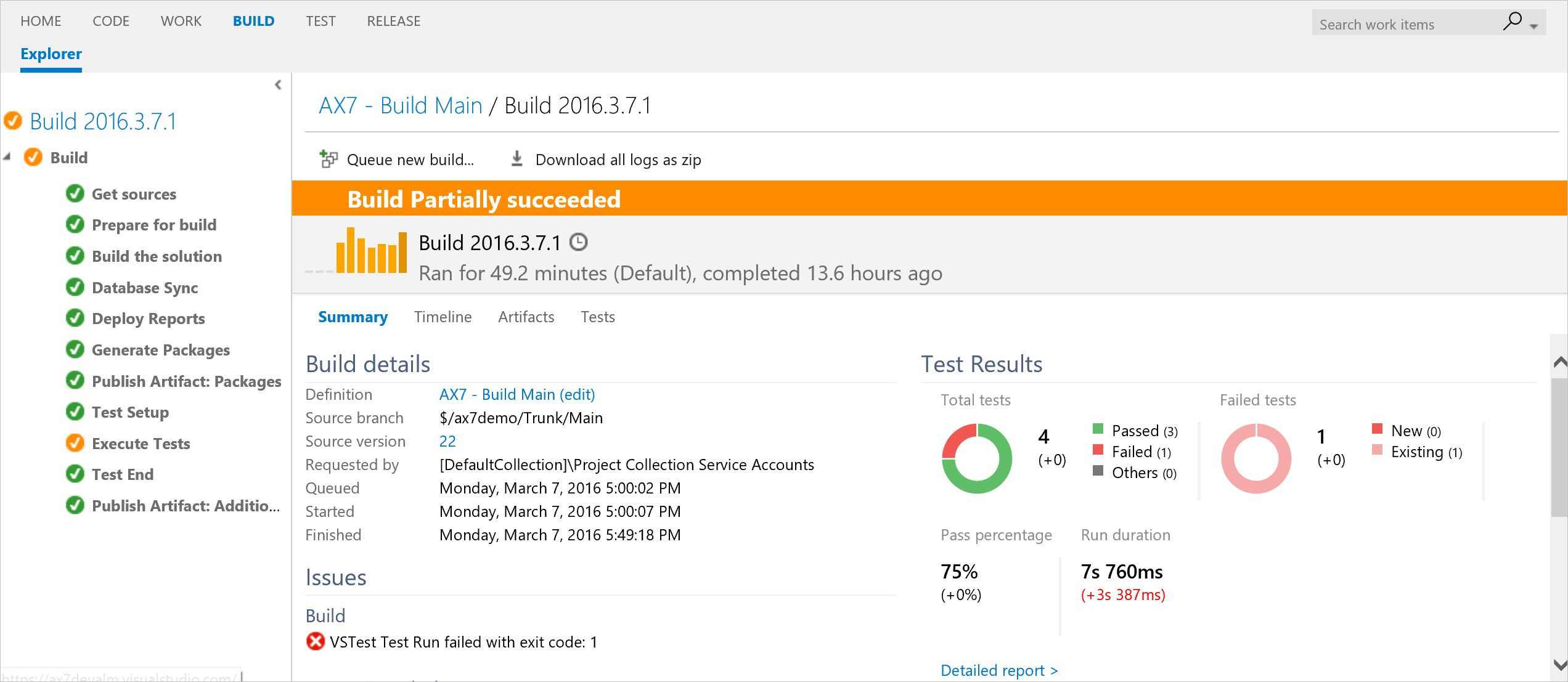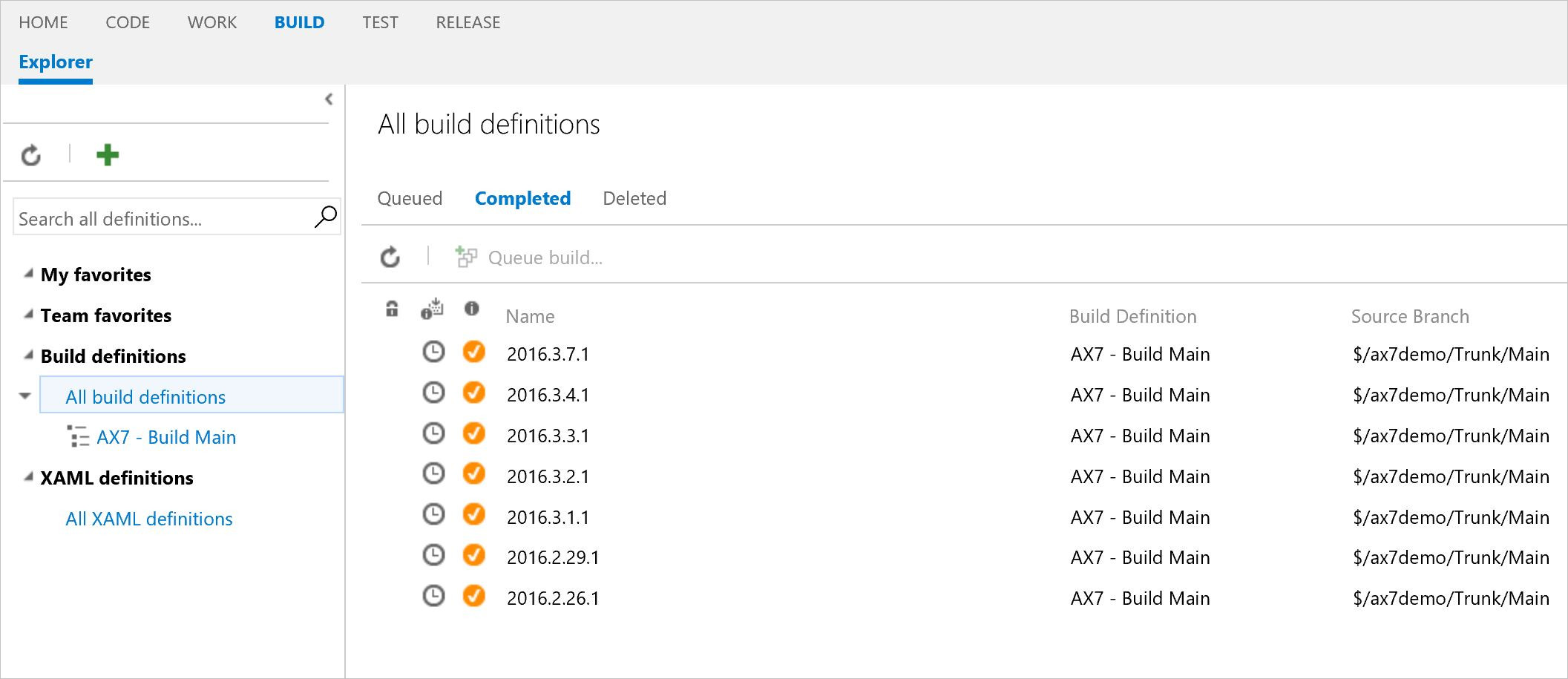 When a Build VM is deployed in Developer topology through LCS, it is pre-configured and ready to start a build. You can change the default configuration at any time from the Visual Studio IDE or the Azure DevOps interface. On a Build VM, the module source code is synchronized to the build machine for easy build setup. The build machine is also auto-configured with default settings for build agent, build controller, build process template, and build definition. Tests that are integrated with build definition are executed after the build is successful.