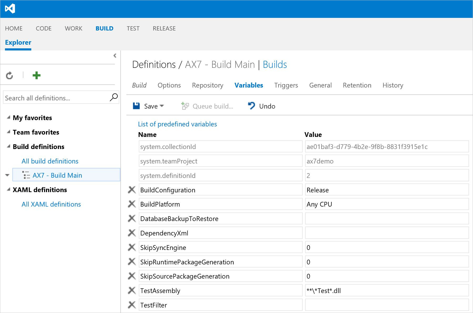 Configure the predefined variables parameters that will be passed to the build. To set up a clean database for every build execution, provide the name of the database backup file for the DatabaseBackupToRestore variable. The packages folder is restored at every build with a copy of a clean package folder.