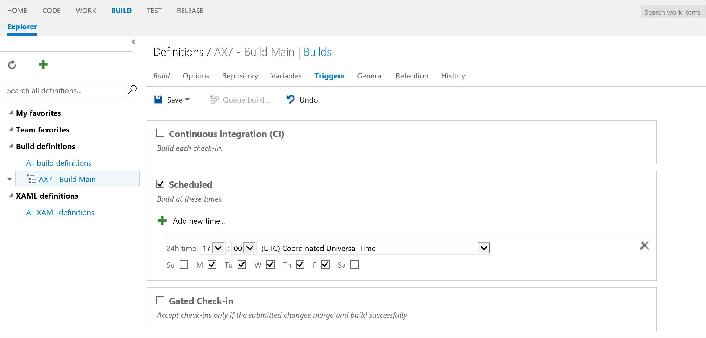 The default build is scheduled to trigger start every day at 5 P.M. You can change trigger as per your team's need to "Continuous" for each check-in.