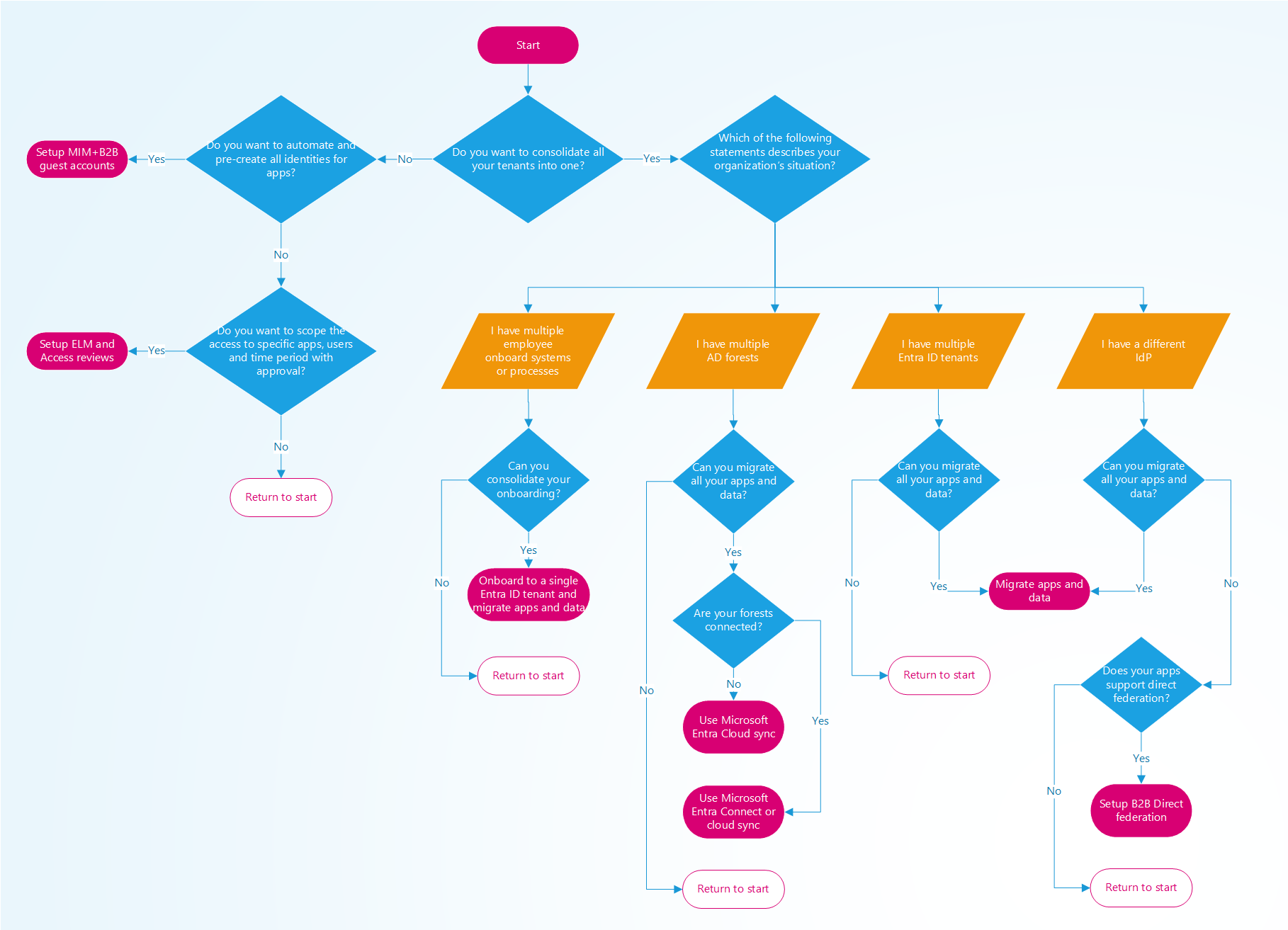 This article covers scenarios when your company is going through a complex scenario outlined below and looking to combine your identity information. Ideally, an organization with a single HR source, a single Active Directory forest, and a single Microsoft Entra tenant, all integrated with the same people in each, will have the best identity experience for their Microsoft Online Services. However, in practice, an enterprise customer may not always be in a situation where that is possible. For example, the customer may be going through a merger, or have a need for isolation for some users or applications. A customer who has multiple HR, multiple AD, or multiple Microsoft Entra tenants must decide on whether to combine to fewer instances of each or keep them in parallel.