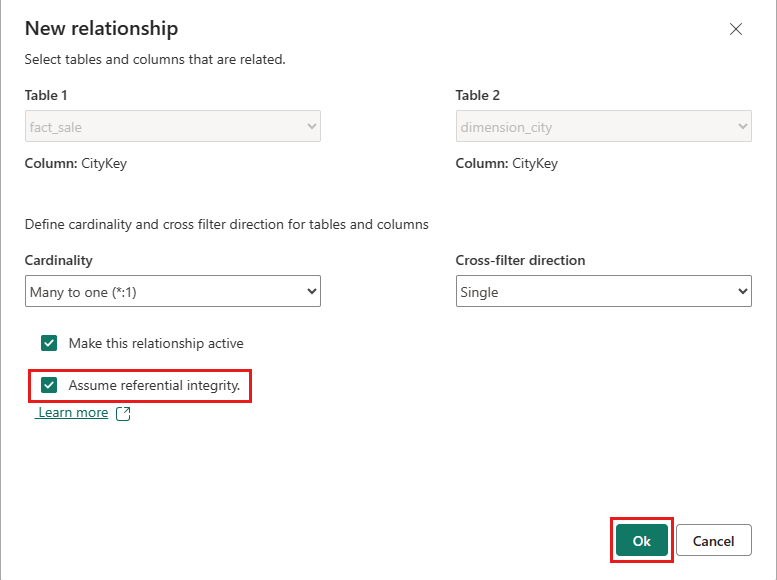 For this data model, you need to define the relationship between different tables so that you can create reports and visualizations based on data coming across different tables. From the fact_sale table, drag the CityKey field and drop it on the CityKey field in the dimension_city table to create a relationship. The New relationship dialog box appears.