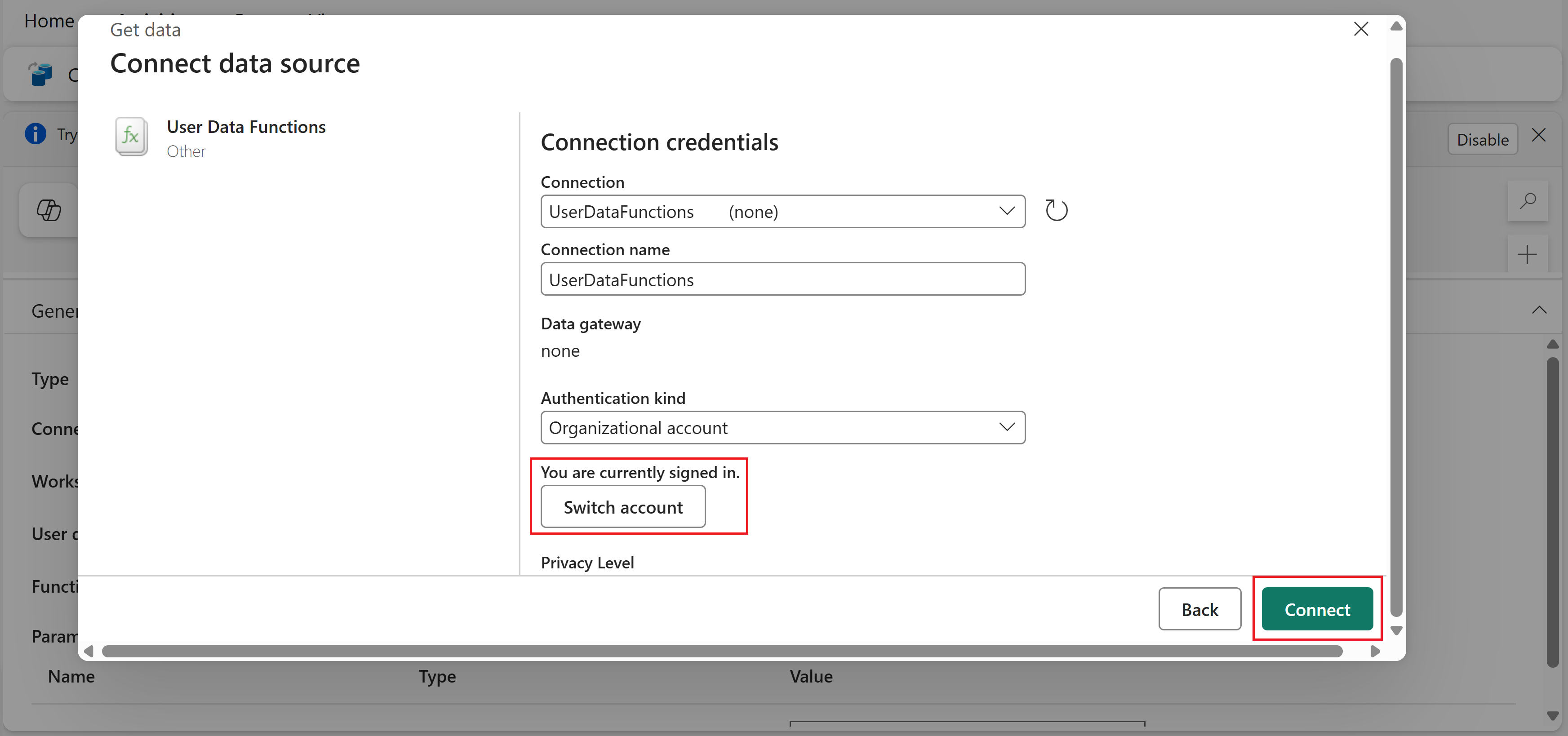 In the Connect to data source dialog, you can keep the default connection name and credentials. Make sure you're signed in, then select Connect.