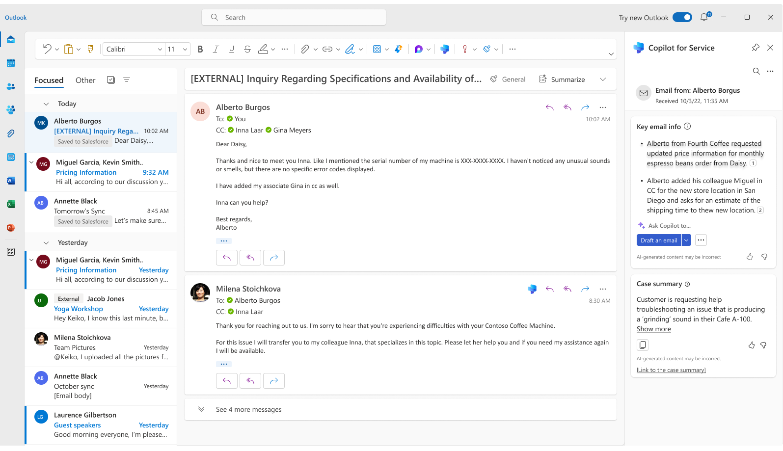 Service in Microsoft 365 Copilot generates case summaries in Outlook to help you quickly understand the context of a case and resolve customer issues more efficiently. The summary includes key information about the case, such as the customer, product, problem statement, and any notes that are linked to the case.