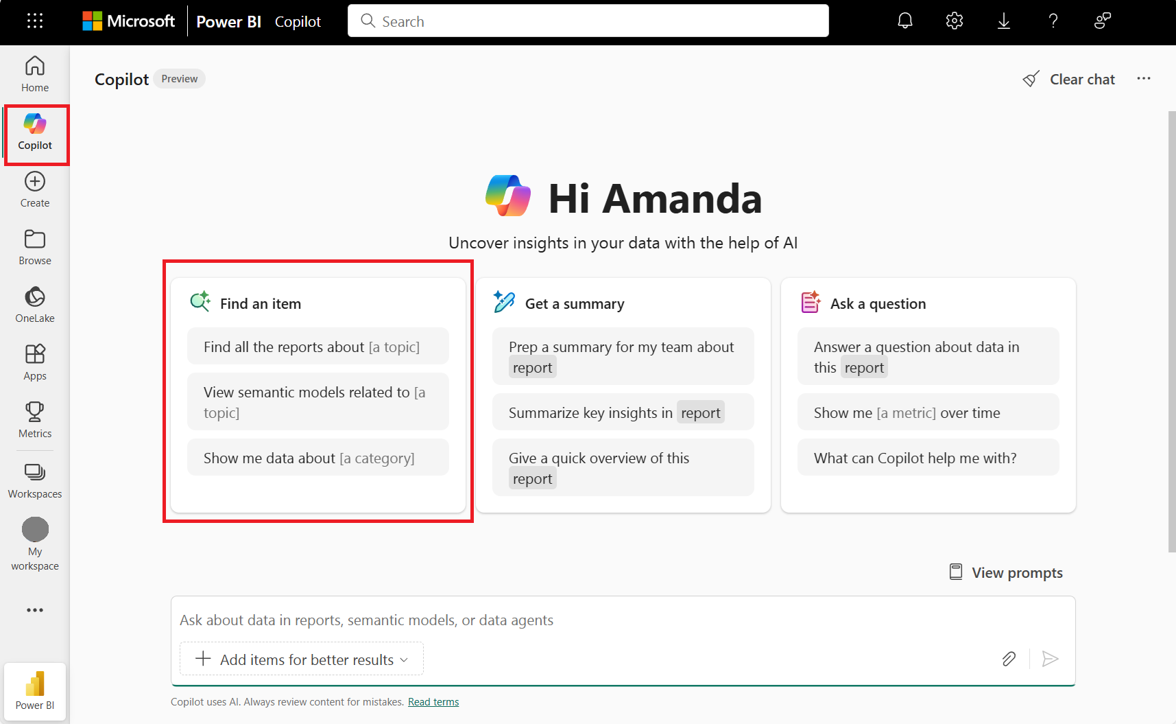 Through the standalone Copilot experience, you can easily find Power BI content and chat with your data. In Power BI's Copilot search, the terms content and items refer to reports, semantic models, workspace apps, organizational apps, and data agents. This page explains when Copilot needs to search for content, the metadata Copilot can look at to find your content, the signals used to boost and increase the relevancy of certain items, and what you can do to make items more discoverable for your end users.