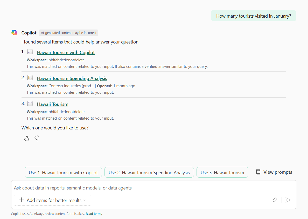 Power BI's standalone Copilot searches for content when you ask a question without attaching a report or semantic model. If you start by asking a broad question like "How many tourists visited in January?" you see a list of items that Copilot could use to answer the question.