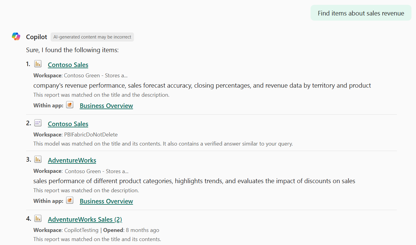 In these search results, Copilot shows the item types that were found through the icons, the title of the item, the workspace the item belongs to, when you last opened it, the description if it has one, the metadata this item matched with from your input, and whether a report is part of an app.