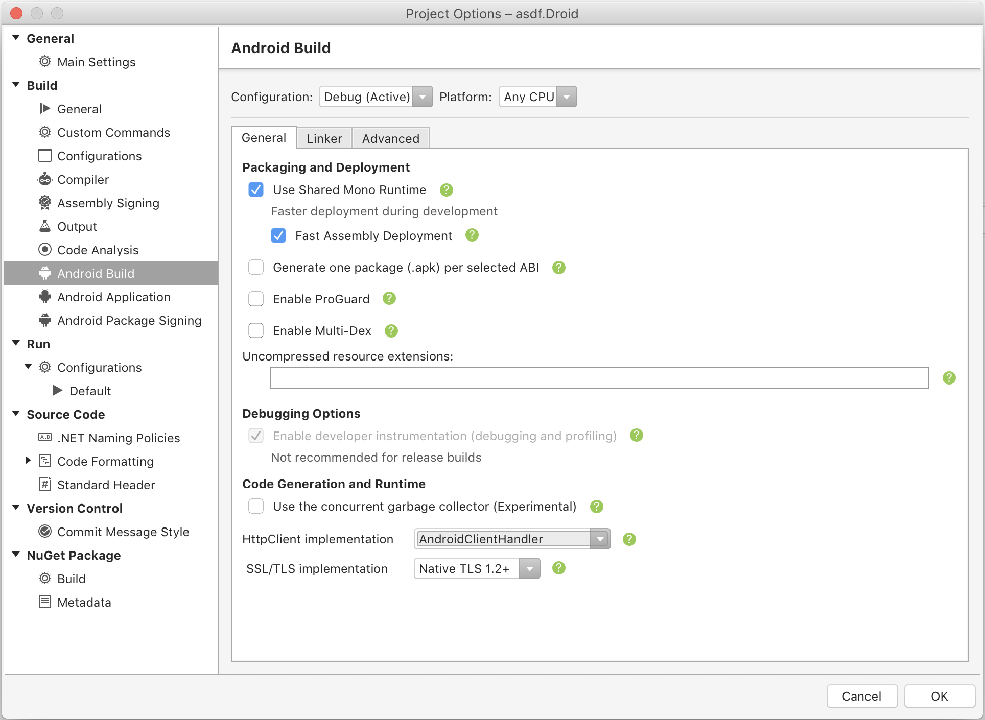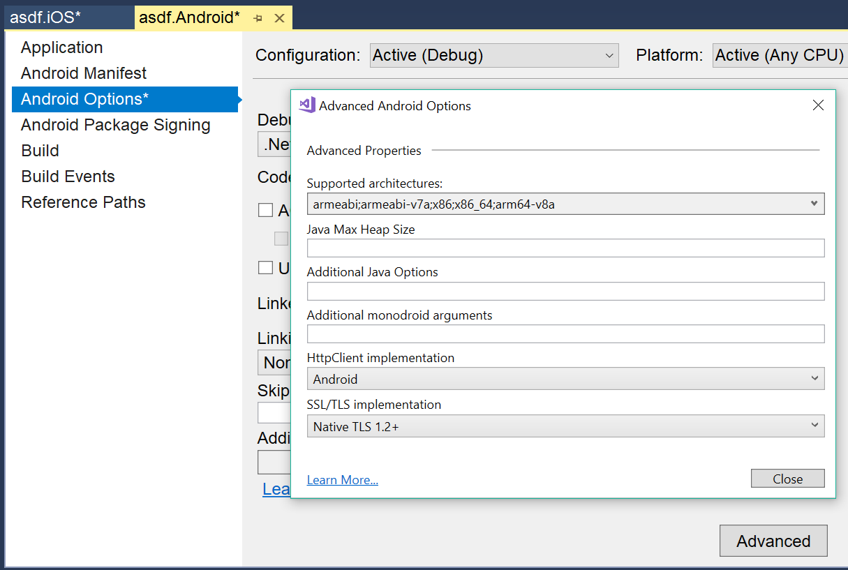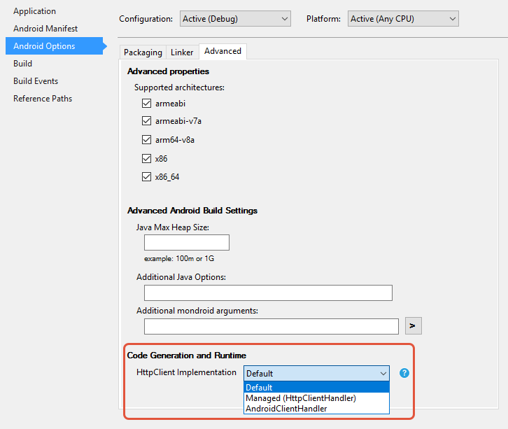 The HttpClient Stack and SSL/TLS Implementation selectors determine the HttpClient and SSL/TLS implementation that will be used by your Xamarin.Android apps.