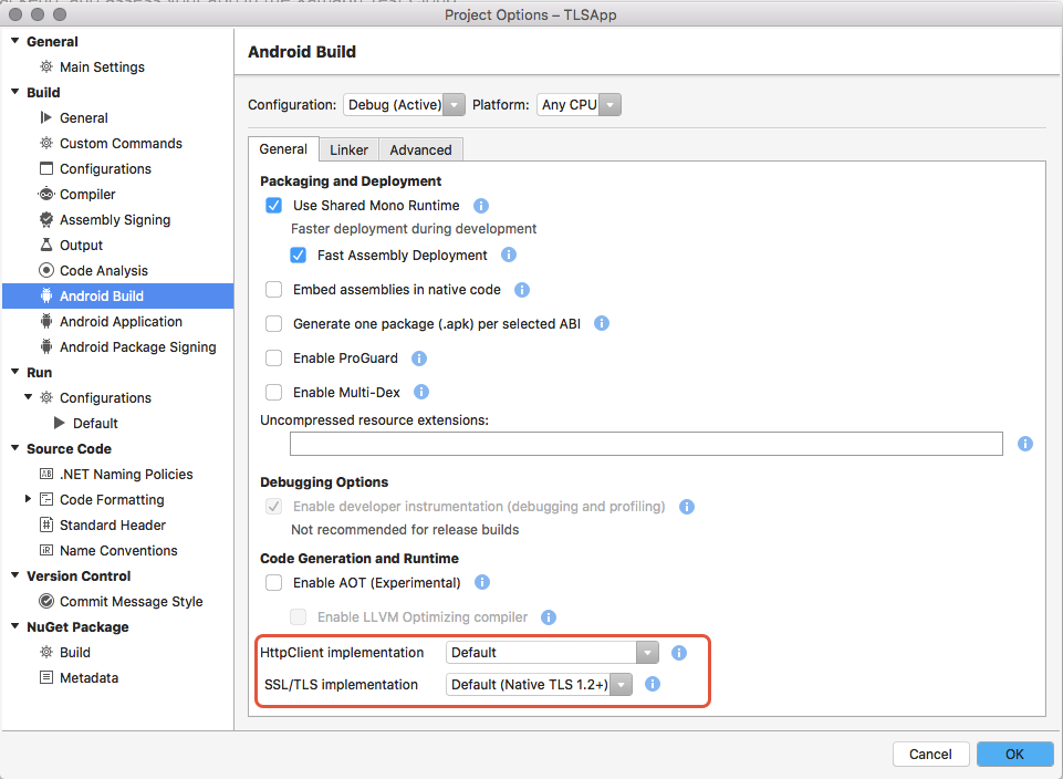 In order to ensure your apps continue to work with these servers and services, you should update your Xamarin projects with the Android HttpClient and Native TLS 1.2 settings shown below, then re-build and re-deploy your apps to your users.