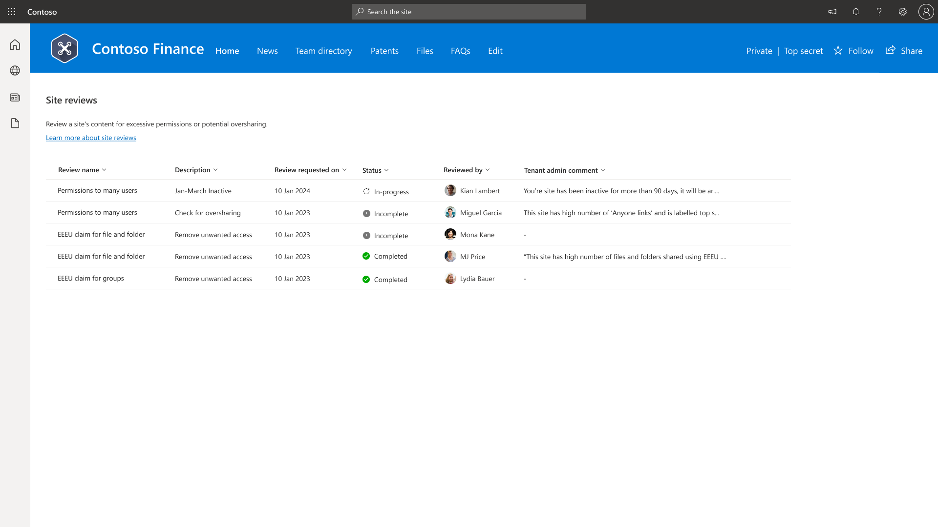 To track all initiated site access reviews, go to the My review requests tab on the Data access governance landing page.