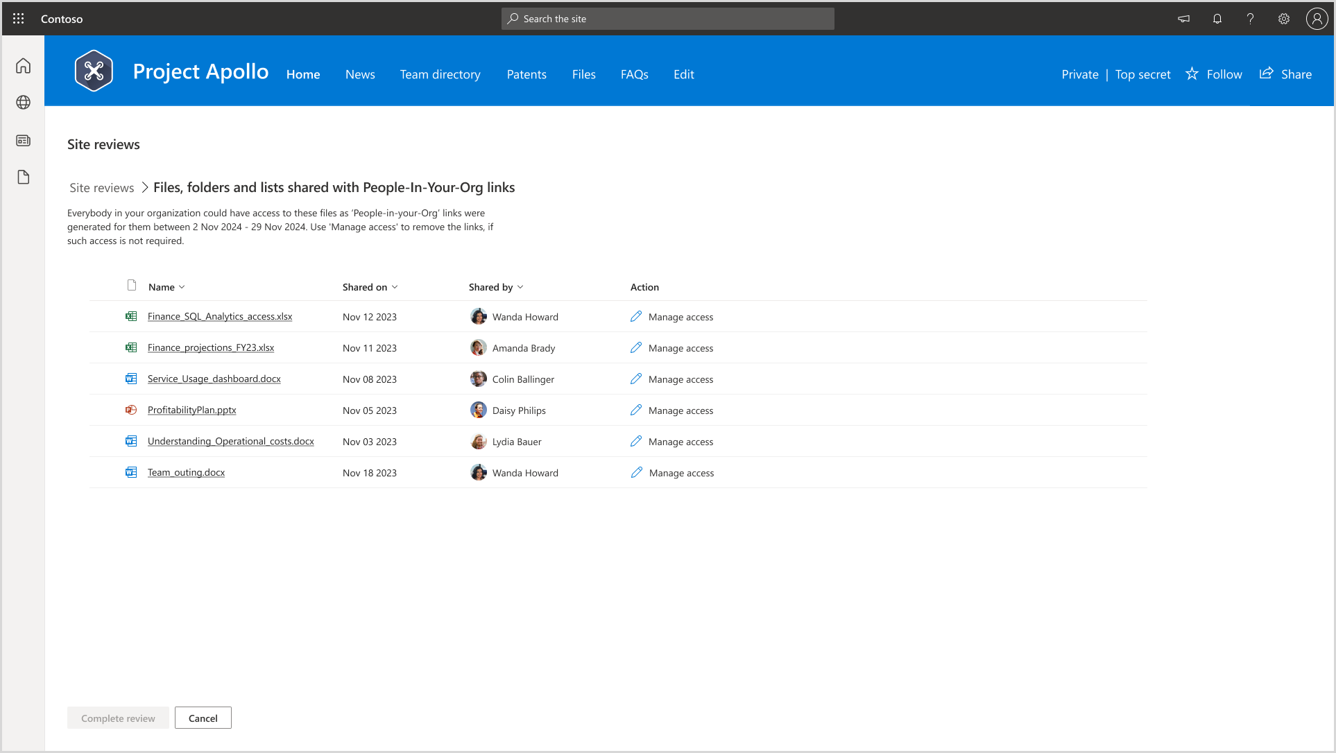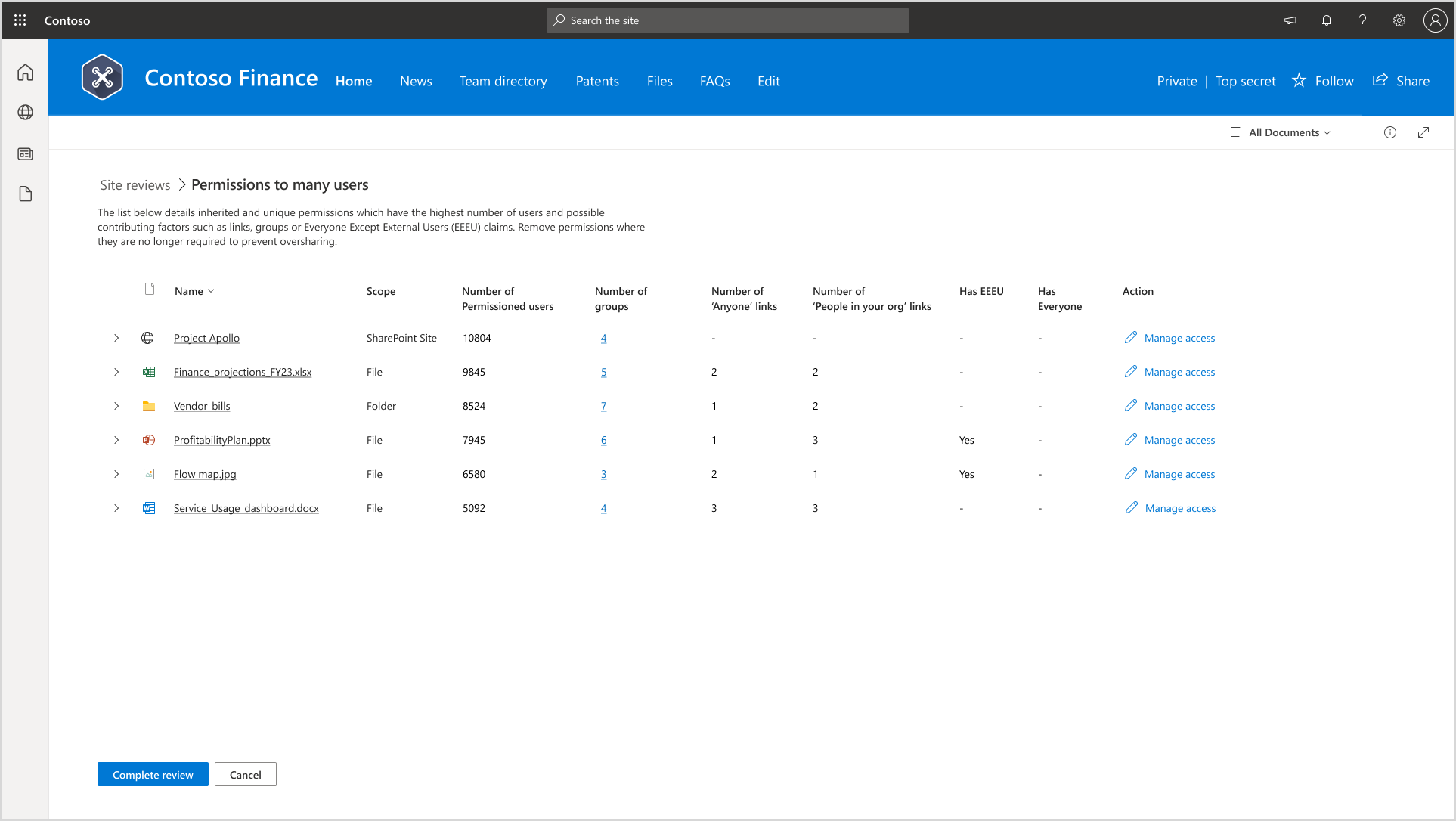 When site owners select the email, they're redirected to the site access review page, where they can see the oversharing baseline using permissions report. This report helps site owners identify items with excessive permissions and take necessary actions.