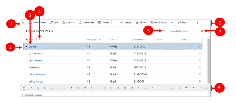 Views are used to display multiple records from a single table at one time. Usually, when you first open a table, you see the list view, which shows a list of rows belonging to that table, formatted as a table. For example, if you open the Products table, you see a list of all the products an organization might sell. Views have various different tools available to assist with finding and managing records.
