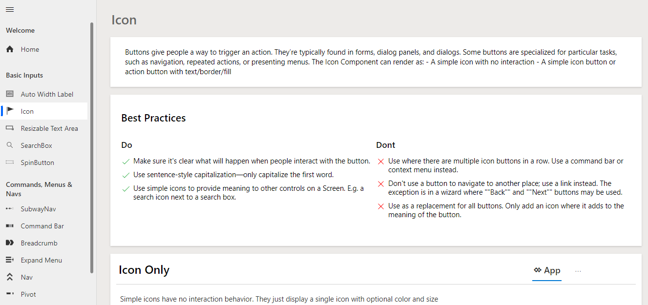 The application showcases several PCF components. Go to the Basic category and select Icon.