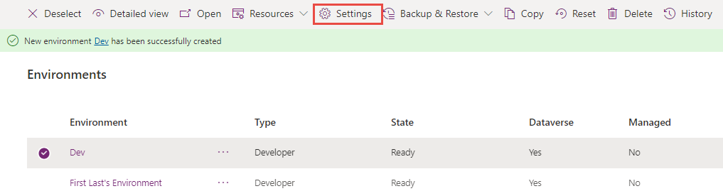 Navigate to Power Apps maker portal and select the Dev environment you created.