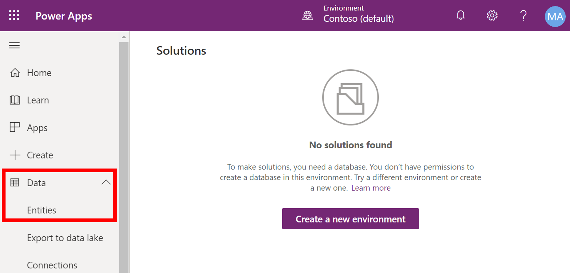 Some environments don't have databases. If you don't have these products in your tenant, you have no access to Dataverse. To check if a data set exists or not, expand Data in the menu and select Entities. You will likely get a message of No solutions found. The button Create a new environment is available.