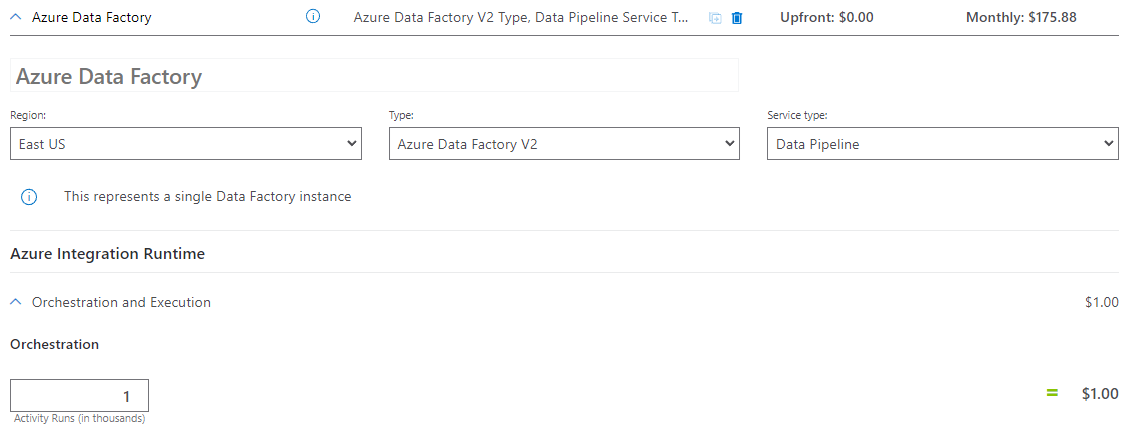 | Eseguire la pipeline | 2 Esecuzioni di attività per esecuzione (1 per l'esecuzione del trigger, 1 per le esecuzioni di attività) = 480 esecuzioni di attività, arrotondate per esaurire poiché il calcolatore consente solo incrementi di 1000. |