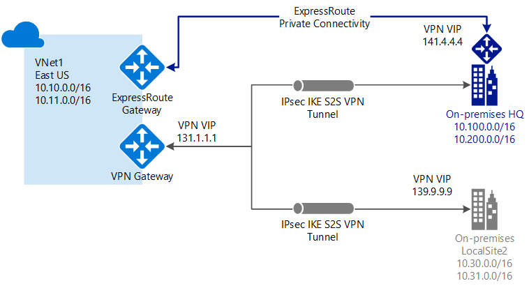 È possibile configurare una VPN da sito a sito come percorso di failover sicuro per ExpressRoute oppure usare VPN da sito a sito per connettersi a siti che non fanno parte della rete, ma che sono connessi tramite ExpressRoute. Si noti che questa configurazione richiede due gateway di rete virtuale per la stessa rete virtuale, uno che usa il tipo di gateway Vpn e l'altro che usa il tipo di gateway ExpressRoute.
