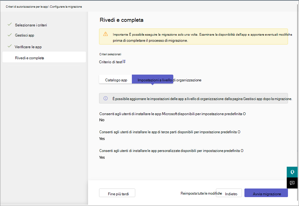 Durante la migrazione, non è possibile apportare modifiche alle assegnazioni delle app. L'interfaccia utente esistente viene disabilitata all'avvio della migrazione. Se non si è pronti per continuare o si vuole apportare modifiche ai criteri di autorizzazione esistenti, aprire la migrazione guidata e selezionare l'opzione Reimposta tutte le modifiche. Si perderà lo stato di avanzamento e sarà possibile riavviare la migrazione in un secondo momento.