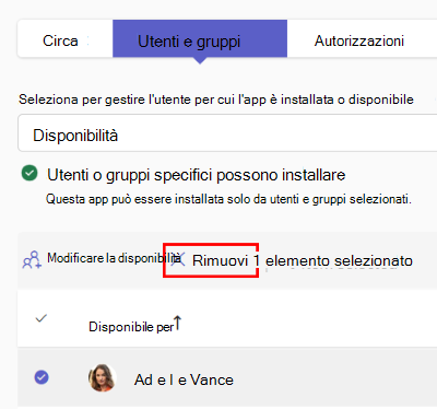 È possibile rimuovere la disponibilità delle app per un utente. Selezionare un'app assegnata direttamente all'utente e scegliere Rimuovi. Non è possibile rimuovere la disponibilità per un utente se l'app è disponibile per tutti o per un gruppo.
