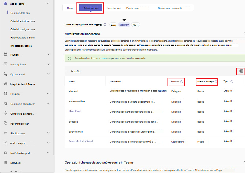 Le autorizzazioni consentono alle app di accedere a risorse privilegiate e di agire per conto dell'utente. Questa funzionalità consente agli sviluppatori di creare funzionalità avanzate nelle app che aumentano la produttività dell'utente. È necessario comprendere chiaramente le autorizzazioni, l'ambito e le implicazioni. Nell'interfaccia di amministrazione di Microsoft Teams è possibile esaminare i rischi di autorizzazione delle app e i livelli di privilegio. Vengono visualizzati anche dettagli sulle operazioni che ogni app può eseguire in Teams. Per altre informazioni, vedere Visualizzare i rischi e i livelli di privilegio per le autorizzazioni delle app.