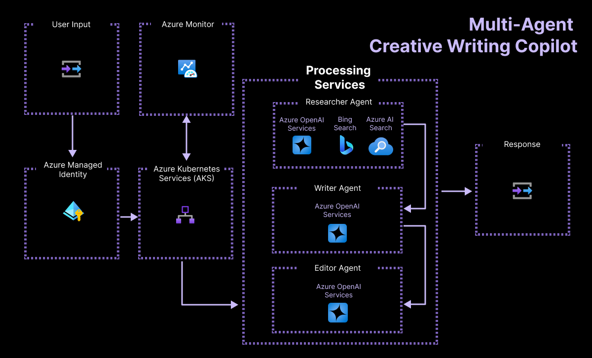 Questo modello è una soluzione creativa che scrive più agenti per aiutare gli utenti a scrivere articoli. Illustra come creare e usare agenti di intelligenza artificiale basati su Azure OpenAI.