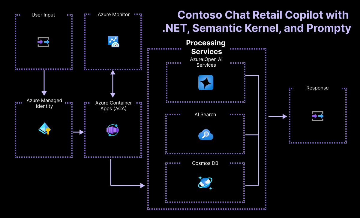 Questo modello implementa Contoso Chat - una soluzione di copilota al dettaglio per Contoso Outdoor che usa un modello di progettazione di generazione aumentata di recupero per mettere a punto le risposte del chatbot nei dati dei prodotti e dei clienti del rivenditore. I clienti possono porre domande dal sito Web in linguaggio naturale e ottenere risposte pertinenti con potenziali raccomandazioni in base alla cronologia degli acquisti, con procedure di IA responsabili per garantire la qualità e la sicurezza delle risposte.