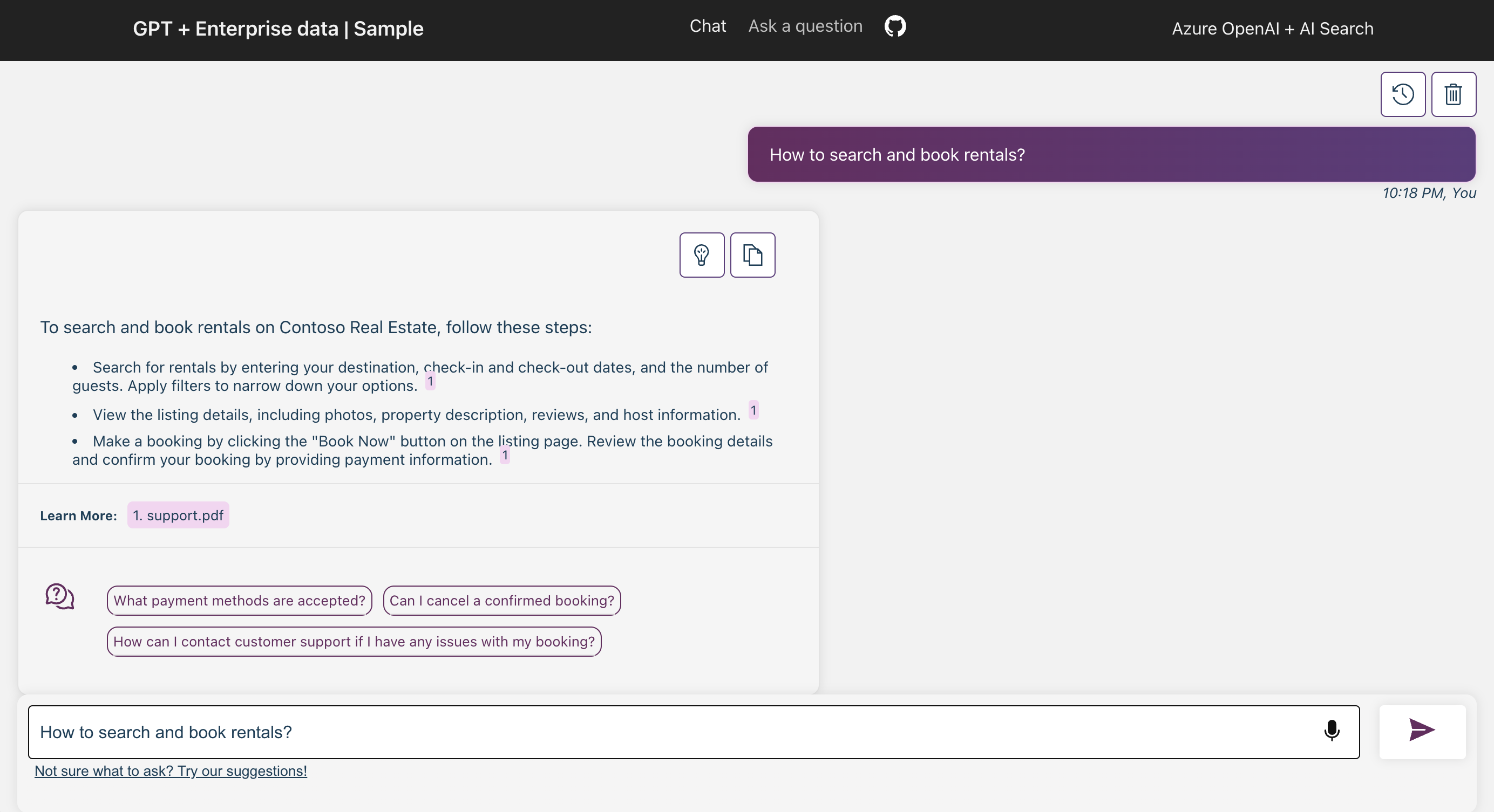 Il modello è un chatbot di intelligenza artificiale serverless con La generazione aumentata di recupero usando LangChain.js e Azure che usa un set di documenti aziendali per generare risposte alle query utente. Usa una società fittizia denominata Contoso Real Estate e l'esperienza consente ai clienti di porre domande di supporto sull'utilizzo dei suoi prodotti. I dati di esempio includono un set di documenti che descrivono le condizioni per il servizio, l'informativa sulla privacy e una guida al supporto.
