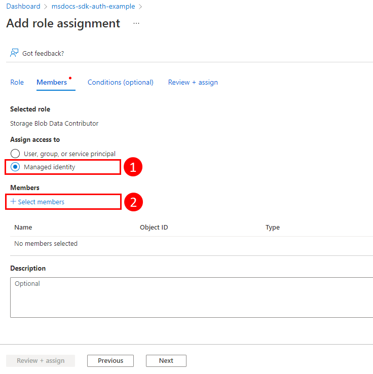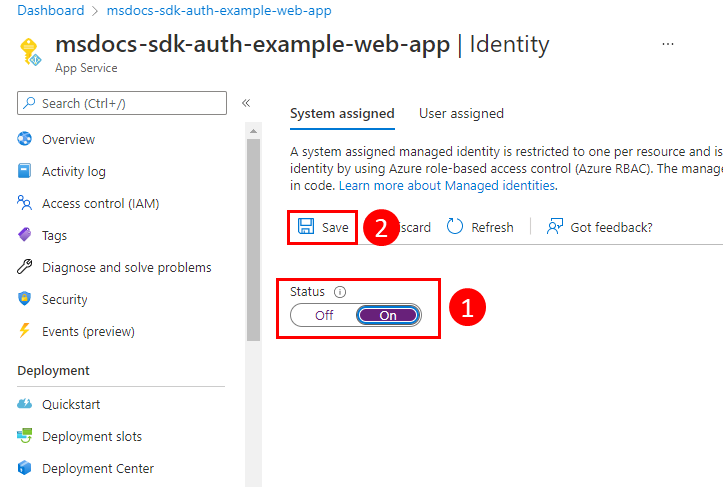Il primo passaggio consiste nell'abilitare l'identità gestita nella risorsa di Azure che ospita l'app. Ad esempio, se si ospita un'applicazione Django usando servizio app di Azure, è necessario abilitare l'identità gestita per l'app Web del servizio app che ospita l'app. Se si usa una macchina virtuale per ospitare l'app, si abiliterà la macchina virtuale all'uso dell'identità gestita.
