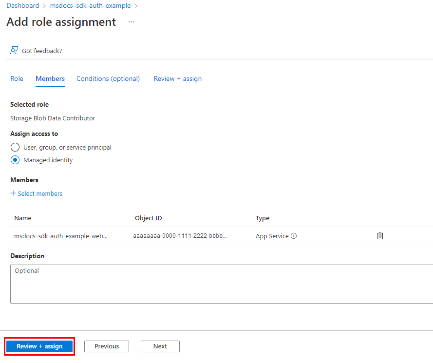 Ad esempio, per consentire all'identità gestita con ID aaaaaaaa-bbbb-cccc-1111-222222222222 l'accesso per la lettura, scrittura ed eliminazione ai contenitori di BLOB di Archiviazione di Azure e ai dati in tutti gli account di archiviazione nel gruppo di risorse msdocs-python-sdk-auth-example nella sottoscrizione con ID aaaa0a0a-bb1b-cc2c-dd3d-eeeeee4e4e4e, si assegnerebbe l'entità servizio applicazione al ruolo di Collaboratore ai dati dei BLOB di Archiviazione usando il comando seguente.