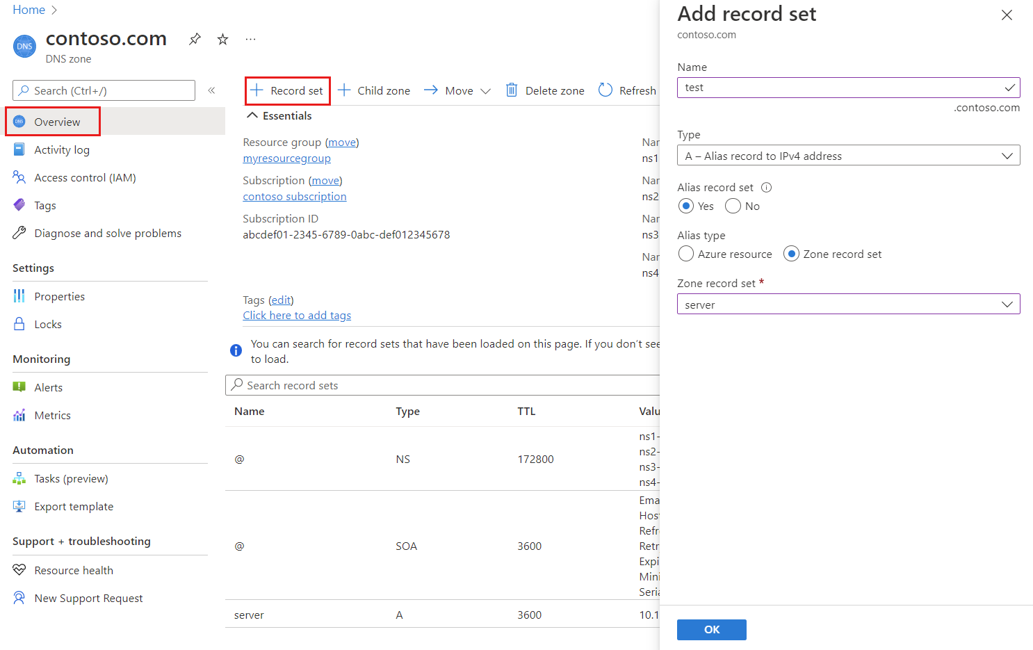 Nella pagina Panoramica selezionare la zona DNS contoso.come e quindi il pulsante Set di record.