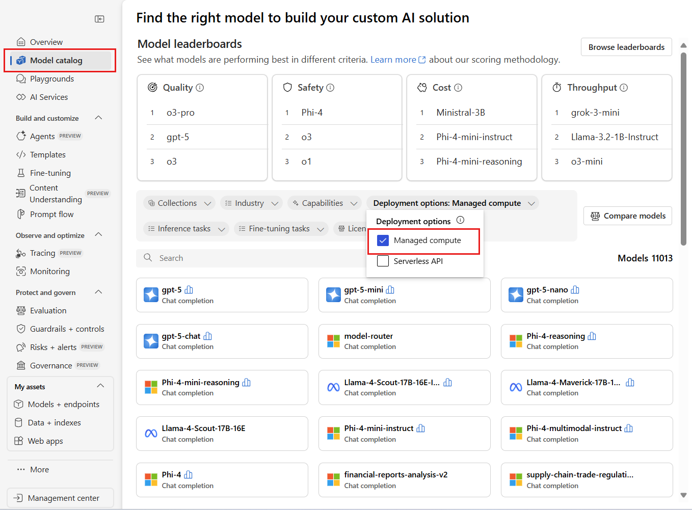 Il catalogo dei modelli del portale di Microsoft Foundry offre oltre 1.600 modelli che è possibile distribuire usando il calcolo gestito (detto anche distribuzione online gestita) per l'inferenza in tempo reale negli ambienti di produzione. Con le distribuzioni di calcolo gestite si ottiene un'infrastruttura scalabile e pronta per la produzione per i modelli linguistici di grandi dimensioni.