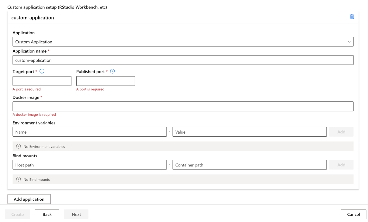 - Selezionare Crea per configurare l'applicazione personalizzata nell'istanza di ambiente di calcolo.
