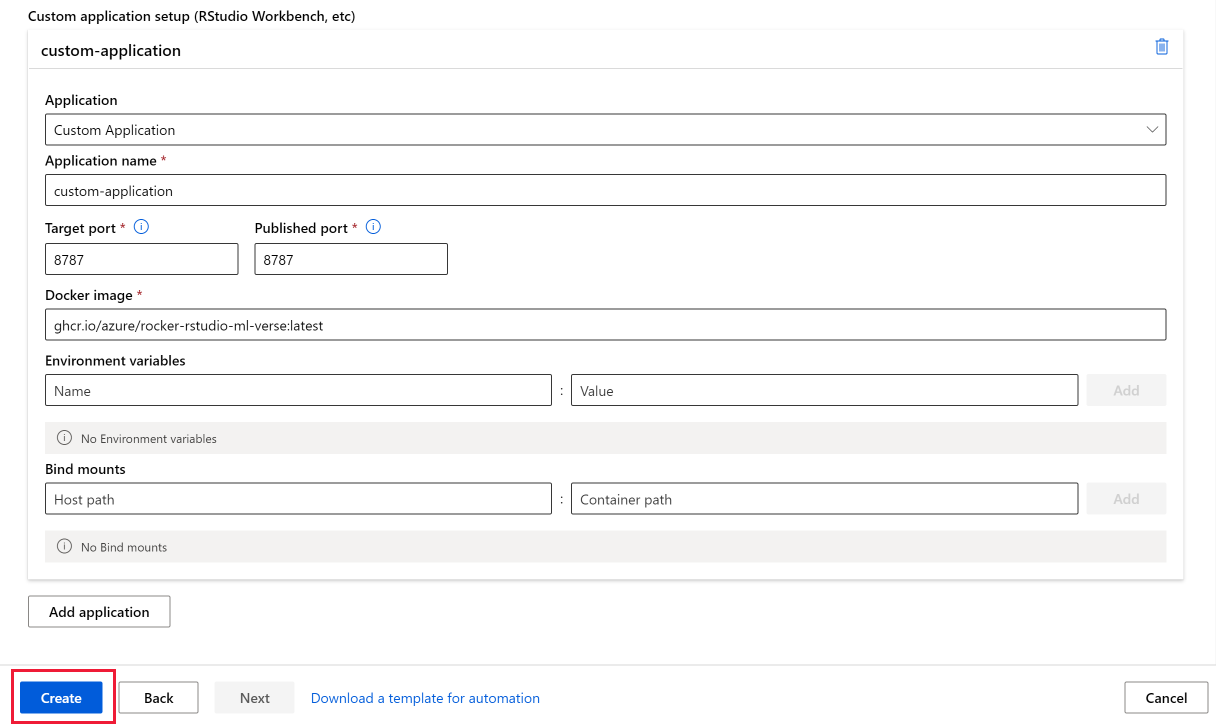 ghcr.io/azure/rocker-rstudio-ml-verse:latest.Selezionare Crea per configurare RStudio come applicazione personalizzata nell'istanza di ambiente di calcolo.