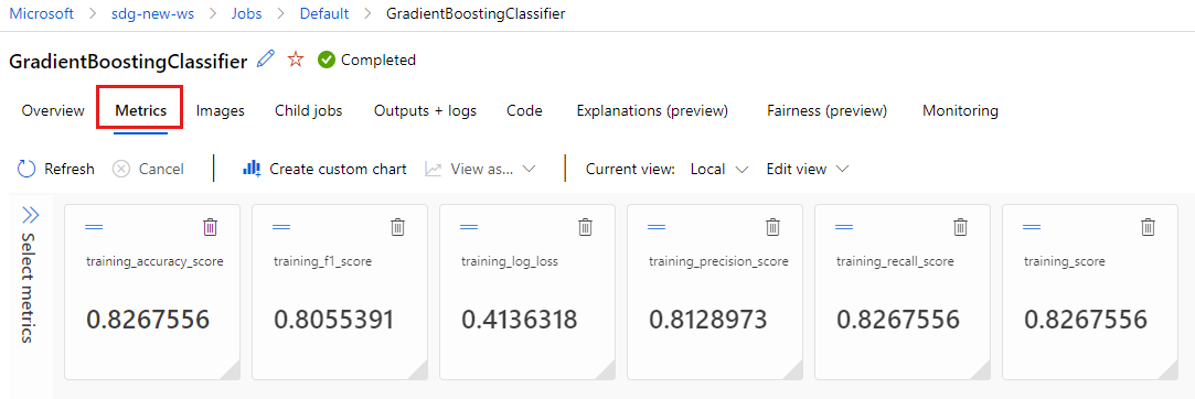 Selezionare la scheda Metriche per visualizzare le metriche registrate da MLflow. I risultati saranno diversi perché si dispone di un set di training diverso.